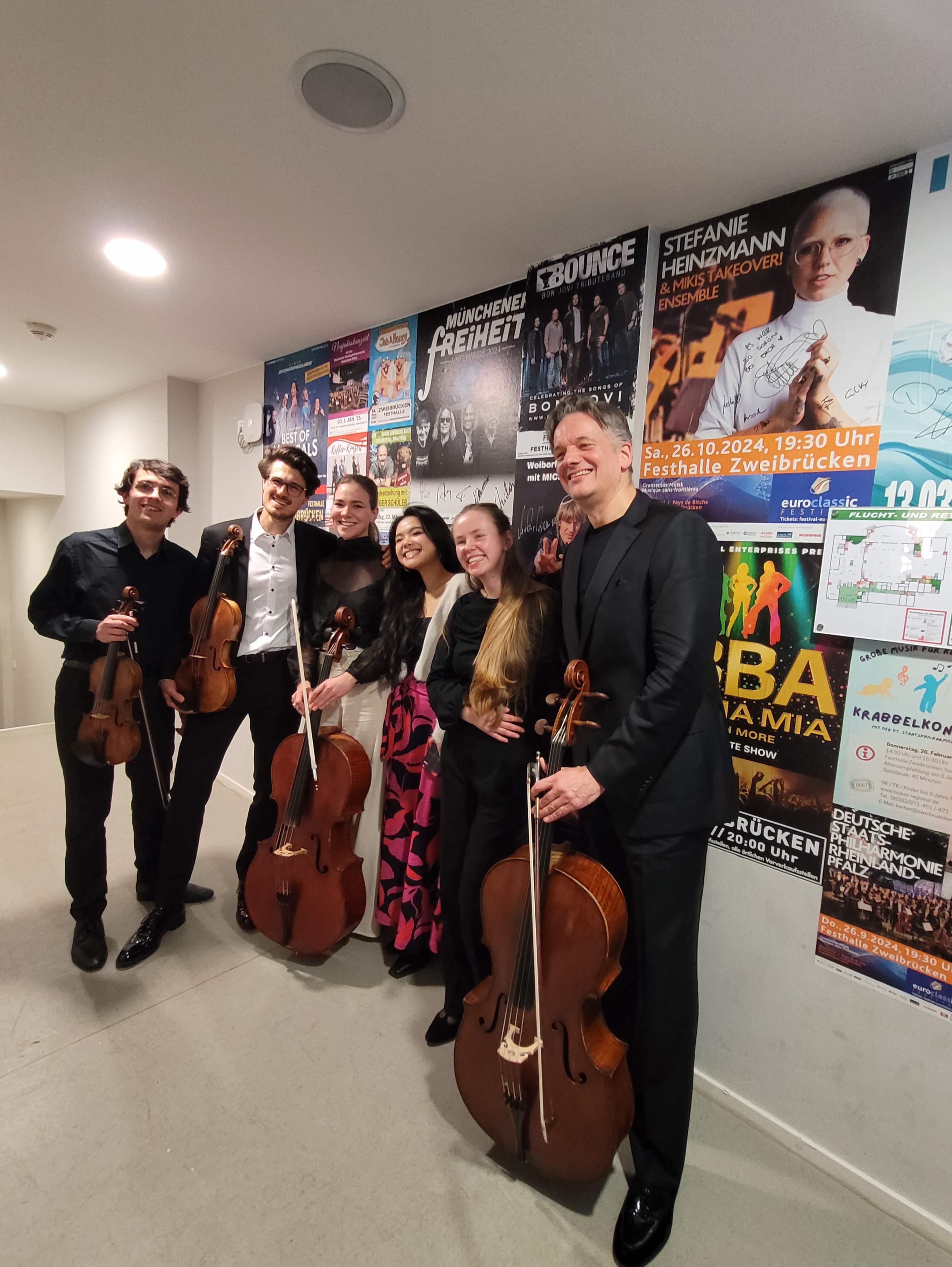 Gerade erst letzte Woche hat er drei fantastische Schubertiaden in Rolandseck, Bad Bergzabern und Zweibrücken mitgestaltet: Schuberts Streichquintett mit Meistercellist Jens Peter Maintz und drei wunderbaren Kolleginnen (siehe Foto links). Doch Eike Coetzee war schon im letzten Jahr bei Villa Musica sehr präsent: im Februar 2025 mit Geigenstar Marc Bouchkov im Mishima-Quartett von Phil Glass in Herxheim, Mainz und Engers und im März mit Pianist Frank Dupree in Gershwins Rhapsody in Blue im Landesmuseum Mainz. Erst vor wenigen Wochen trat er im Duo mit unserer Künstlerischen Leiterin Ervis Gega auf: beim Treffen der Ministerpräsident(inn)en in Mainz.