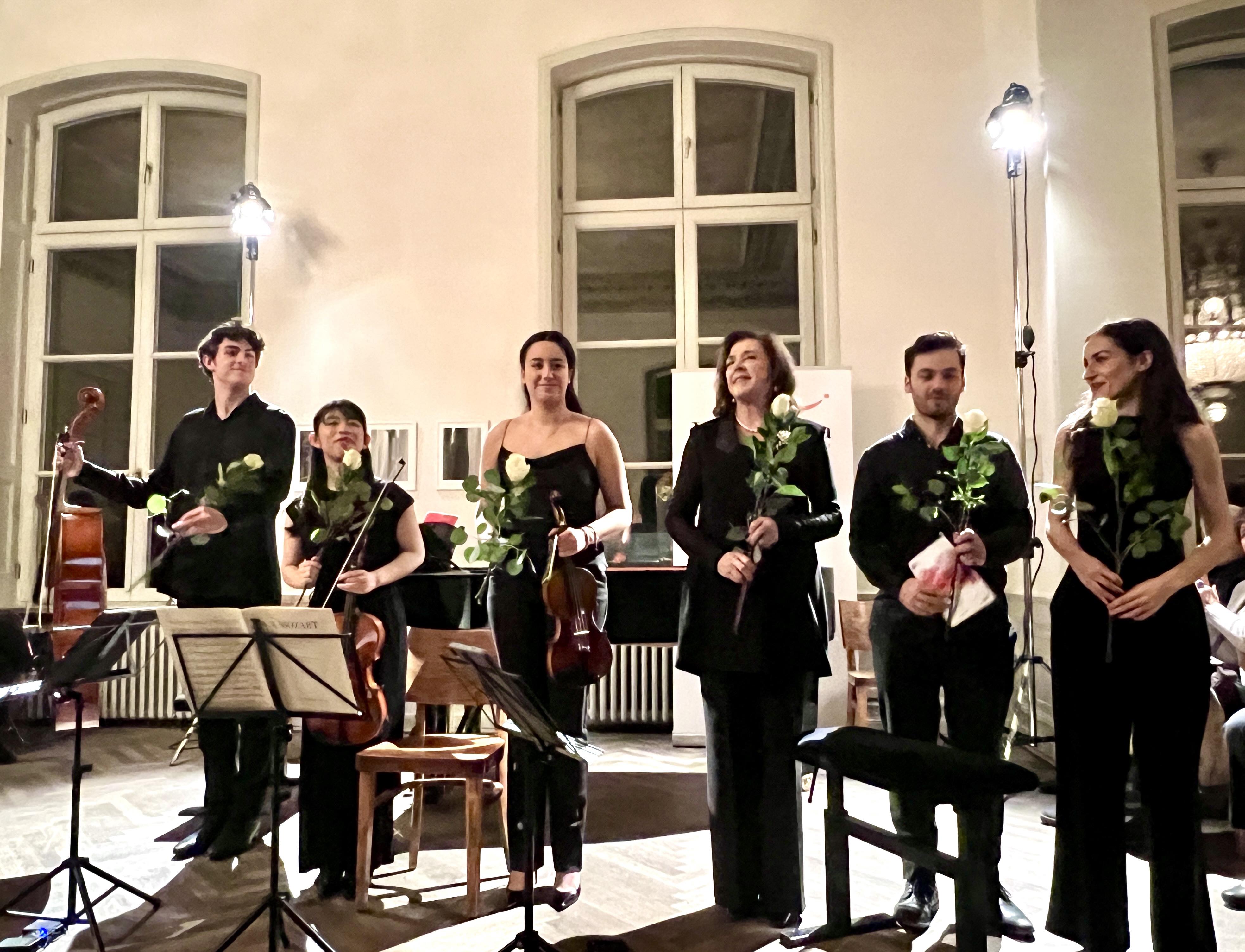 Schöner kann man Mozart nicht spielen: Elena Bashkirova entfaltete im stürmischen g-Moll-Klavierquartett ihre überlegene Anschlagskultur und einen so innigen, dramatischen, vielfarbigen Dialog mit den drei Streichern, als habe sie Mozart selbst über die Schulter geschaut. Die drei Villa Musica-Stipendiat(inn)en Lir Vaginsky an der Violine, Riko Eto an der Bratsche und Syon Najman am Cello erwiesen sich als ideale Gesprächspartner – nach nur wenigen Probentagen in Berlin. Vor der Pause durften sie mit Hallel Tutter an der zweiten Violine und unserem Ex-Stipendiaten Daniel Kamien am Kontrabass das kleine Orchester formen, das Elena Bashkirova in zwei besonders schönen Klavierkonzerten begleitete. Das prachtvolle C-Dur-Konzert KV 415 spielte Mozart 1783 vor Kaiser Joseph II. – ein wahres Kaiserkonzert mit Marschthema und einem Finale voller Überraschungen. Das kleinste seiner Es-Dur-Konzerte KV 449 komponierte er 1784 für seine Schülerin Babette von Ployer. Das hinreißend schöne Andantino und das kontrapunktische Finale klangen im Arp Museum wie feinste Kammermusik und entfalteten im Dialog zwischen Streichern und Klavier ihre ganze opernhafte Lebendigkeit. Wieder ein Abend voller Glamour, Glanz und glitzernder Beredtsamkeit im Arp Museum Bahnhof Rolandseck.