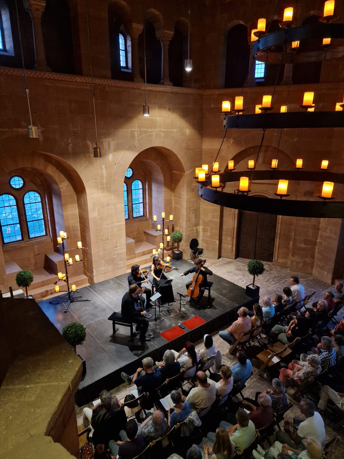 Das junge preisgekrönte Quartett zeigte sich in bester Form, unbeeindruckt von so manchem Nebengeräusch auf dem Innenhof des Mainzer Landesmuseums. David Petrlik hat mit Yoan Brakha an der zweiten Violine, Hortense Fourrier an der Viola und Rémi Carlon am Violoncello drei fantastische Mitspieler(inn)en und die ideale Balance gefunden. Das hoch gepriesene junge Quartett wurde 2017 gegründet und beim renommierten Concours in Genf mit dem zweiten Preis und dem Sonderpreis der Fondation Etrillard ausgezeichnet. Es ist außerdem Preisträger des Carl-Nielsen-Wettbewerbs in Kopenhagen und in bedeutenden Konzertsälen aufgetreten (Philharmonie de Paris, Victoria Hall Genf, Philharmonie Luxemburg, Alte Oper Frankfurt). In den letzten Jahren konnte es sich einen festen Platz in den großen Kammermusik-Institutionen von Frankreich und Belgien sichern.